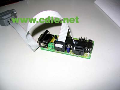 为了方便使用我们需要做一个下载头,图五中之所以有两个接头是因为我的目标板原先没有设计专门的下载线接口,所以要针对目标板做上两个接头。大家可以在一条下载线上做一个接头,再根据不同的目标板做不同的转接头。图六则是下载线用在我的目标板上。电路很简单接线正确的话一般无需要调整就可以正常使用,如有问题可以用软件中的IspTest.exe(下载线调试程序)检查你的74HC373芯片是否正常和你的电脑并口是否正常,检查的方法是按程序的中按键再用万用表看看相关的引脚电平是否正常。要注意的是软件只支持LPT1(378H)。