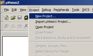 接着按下面的步骤建立您的第一个项目: (1)点击Project菜单,选择弹出的下拉式菜单中的New Project,如图1-2。接着弹出一个标准Windows文件对话窗口,如图1-3,这个东东想必大家是见了N次的了,用法技巧也不是这里要说的,以后的章节中出现类似情况将不再说明。在"文件名"中输入您的第一个C程序项目名称,这里我们用"test",这是笔者惯用的名称,大家不必照搬就是了,只要符合Windows文件规则的文件名都行。"保存"后的文件扩展名为uv2,这是KEIL uVision2项目文件扩展名,以后我们可以直接点击此文件以打开先前做的项目。 |