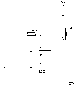 3.复位 RST 9 在振荡器运行时,有两个机器周期(24个振荡周期)以上的高电平出现在此引腿时,将使单片机复位,只要这个脚保持高电平,51芯片便循环复位。复位后P0-P3口均置1引脚表现为高电平,程序计数器和特殊功能寄存器SFR全部清零。当复位脚由高电平变为低电平时,芯片为ROM的00H处开始运行程序。常用的复位电路如图2-3所示。 *复位操作不会对内部RAM有所影响。