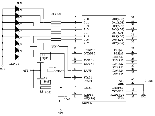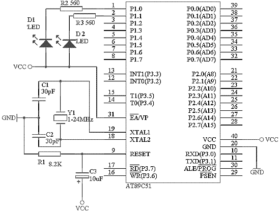 XTAL1 19 XTAL2 18 XTAL1是片内振荡器的反相放大器输入端,XTAL2则是输出端,使用外部振荡器时,外部振荡信号应直接加到XTAL1,而XTAL2悬空。内部方式时,时钟发生器对振荡脉冲二分频,如晶振为12MHz,时钟频率就为6MHz。晶振的频率可以在1MHz-24MHz内选择。电容取30PF左右。 *型号同样为AT89C51的芯片,在其后面还有频率编号,有12,16,20,24MHz可选。大家在购买和选用时要注意了。如AT89C51 24PC就是最高振荡频率为24MHz,40P6封装的普通商用芯片。