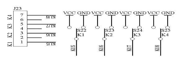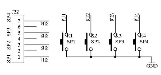 22.独立式键盘模块 键盘是人机通信不可缺少的部件,独立式键盘是最基本的一种键盘方式,在本系统中提供了四个独立式按键;具体的电路原理图如图1.22所示:
