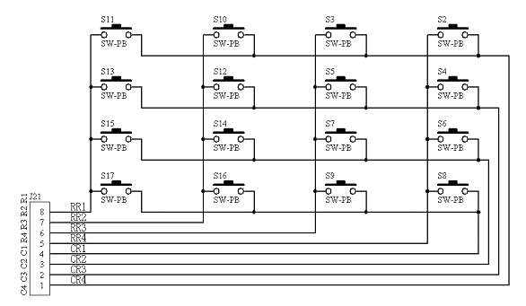 23.4×4行列式键盘模块 行列式键盘也即矩阵式键盘,它由行和列组成,在每个行列的交叉点上放置一个按键,这样4×4行列式键盘共需要16个键盘组成;具体的电路原理图如图1.23所示: