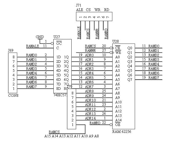 24.32KB数据存储器模块 为了适应大容量的数据处理的需要,在系统板上加入了32KB数据存储器(RAM),数据总线从“D0-D7”的端口输入,高8位地址总线从“A8-A15”端口输入,控制数据存储器的读写控制信号从“ALE CS WR RD”端口输入,具体的电路原理图如图1.24所示: