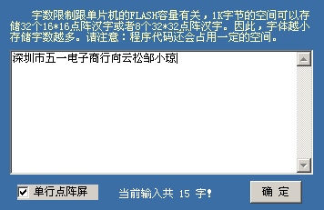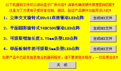 1、本软件使用方法特简单,可以运用鼠标完成全部过程: 2、点鼠标可以改变色彩,双击左键启动移动鼠标连续更改。 3、点击过程中,代码已经自动生成了,想怎么用就怎么用吧。 4、点击软件中的 、、或 就可以将文字或者图片自动生成代码! 5、点“大、小”可以改变字体和图片的可视大小,点“上、下、左、右”可以微调文字或者图片的起始位置! 6、由“发送”可以将代码发送到产品,如果发送到单片机实验板,可以看到板的指示灯会闪亮! 6、点色块可以改变当前字体的显示颜色数,后面有“红、绿、兰”三种颜色的开关,用于彩色点阵代码! 6、点“设定大小”可以改变字体或者图片的可视大小,不同的大小,数据代码会有一定的区别! 6、点左边下面文本框,可以复制代码!注:修改屏中的数据的话会自动更新代码为单帧代码 6、点“段1~段8”可以分别输入8段短语,每个短语限256个英文数字或者128个中文字符! 6、点“文字预览”可以打开大的文本框,方便修改内容。 6、点击“保存”可以保存8段文字代码内容和单帧的点阵代码,当然,保存了就是为了下一次“打开”。! 6、选择“字体列表中的字体”,可以改变字体样式,一般16点阵推荐用宋体! 6、注意事项:请避免用长内容、大字体生成很大很大的数据代码发送,这需要等很长时间才能完成,中途无法取消!(会用PHOTOSHOP软件的朋友就知道,图象的长宽增大,电脑速度会明显变慢,这是因为数据量会成平方倍的增加的缘故。) 另外,软件中有些其它正在设计的新功能还不完美,本软件会不断的增加和完善功能,欢迎常来五一电子网站。 请点击摇摇棒、LED点阵图形编辑代码自动生成器,建议下载时先保存再运行。