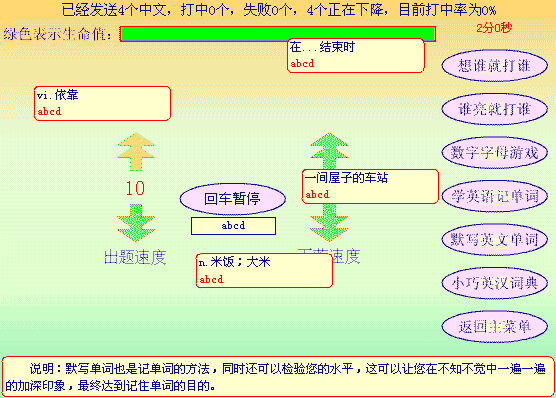 学英语中的打英语功能,学英语有用。记得我初学电脑时,总是对键盘上“密密码码”的按键感到头痛,在键盘上寻找某个按键还要找半天是常有的事。这个打字功能可以帮助初学电脑的人练习盲打。虽然该类型的软件特别多,但是象本FLASH这么小体积、不需安装、即开即用的还真是少见!
