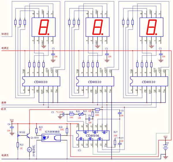 因此,整个过程: …… → 用几毫秒计数复位(显示上次的数) → 长达1秒的计数(显示上次的数)→ 周期到了用几毫秒读取本次计数并锁存 → 用几毫秒计数器复位(显示上次的数)→ ……,如此周而复始,这样我就可以看到延时一个周期的电动机的实时转速。我们将同期调节到1秒零几个毫秒,这样,我们测得的数据就每秒钟转多少圈。如果我们将CD40110的锁存脚LE改接成低电平,将复位脚RST接一个手工复位开关,就成了一个常用的电子计数器。