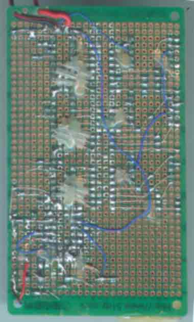 下图是站长用万能板组装好的实物参考:(因为是实验,所以就随便组装、随便布局、随便焊接,导线也乱飞乱连了!提示:CD40106中的6个反相器是相同的,是可以互换的,所以,实物图和原理图的引脚位置会有差别是正常的。)