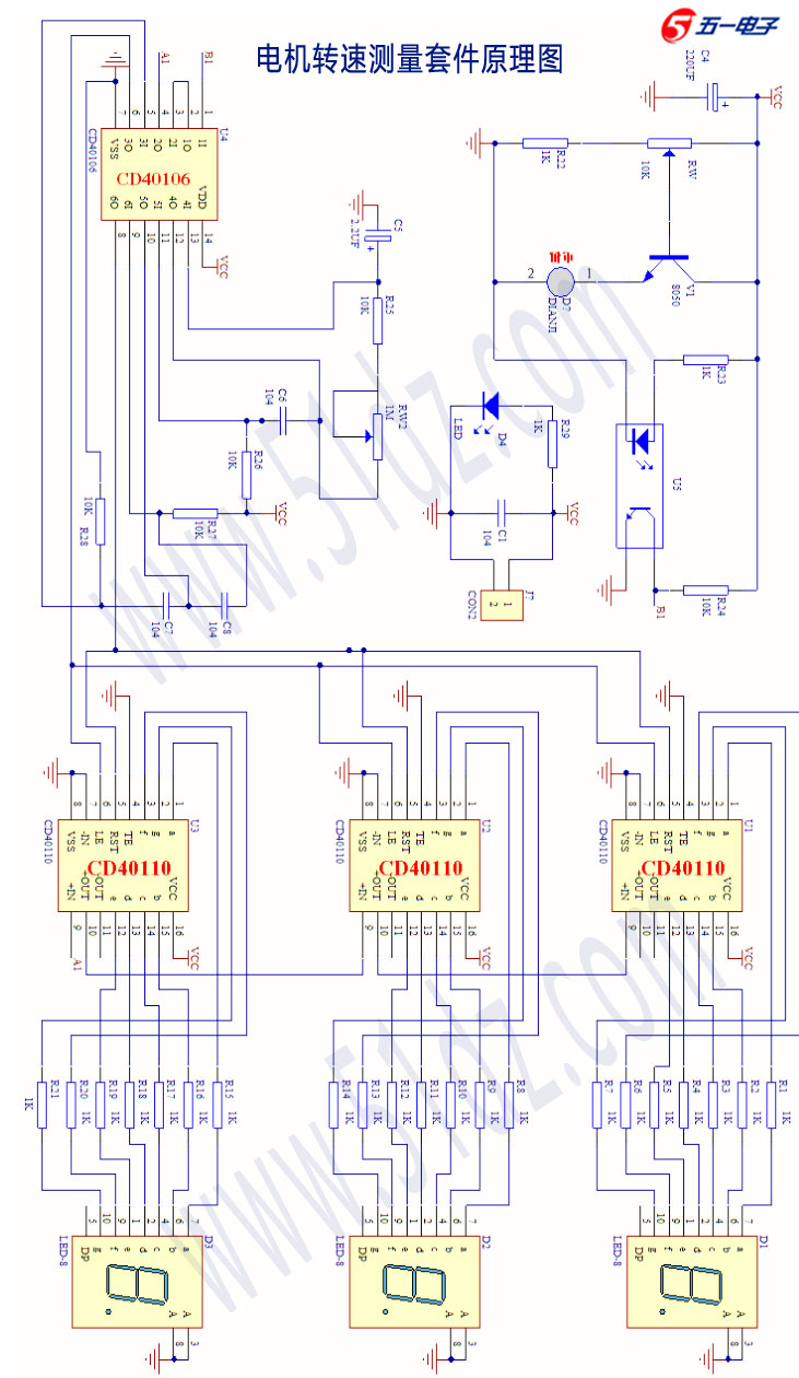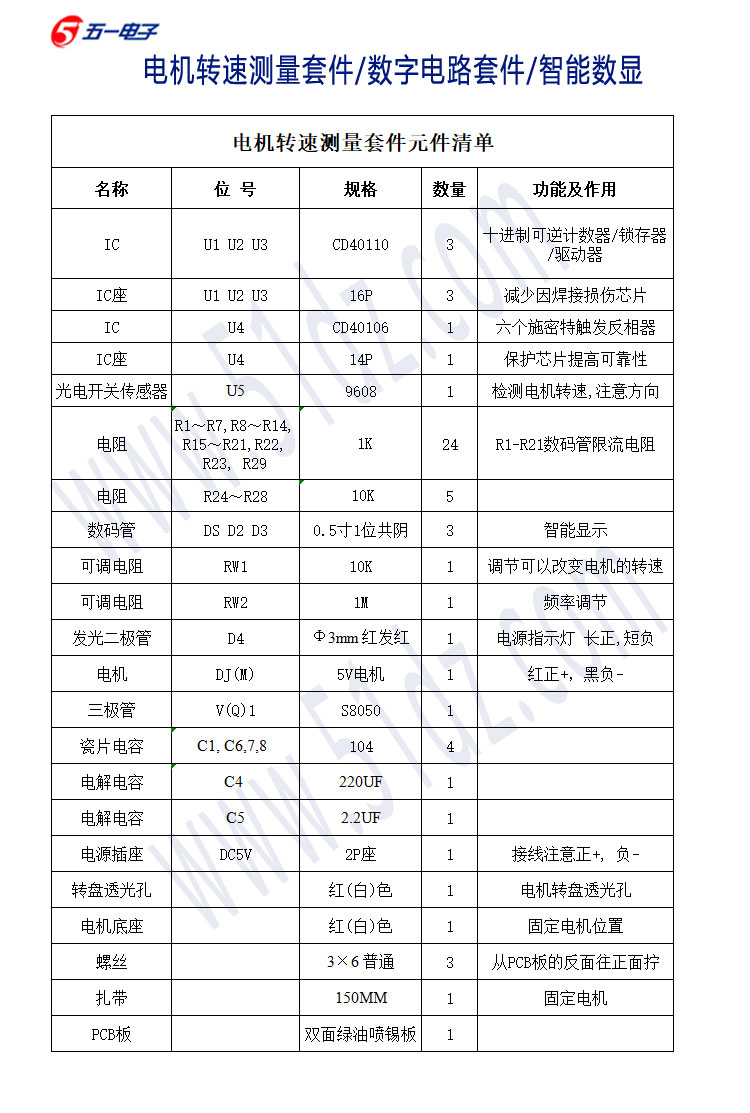 电机转速测量套件:现配有元件清单、原理图、双面玻纤PCB印刷电路板、所有元件和制作说明。本套件一般安装无误都是会一次性成功,全部配有IC插座,如果是IC有问题的话,方便更换使用。本站配的IC都批量试过才发货的,大家放心使用。本套件以数字电路为核心,通过光电开关传感器检测电机转动产生速度电信号,用数字电路进行计数,并采用数码管显示电机速度。